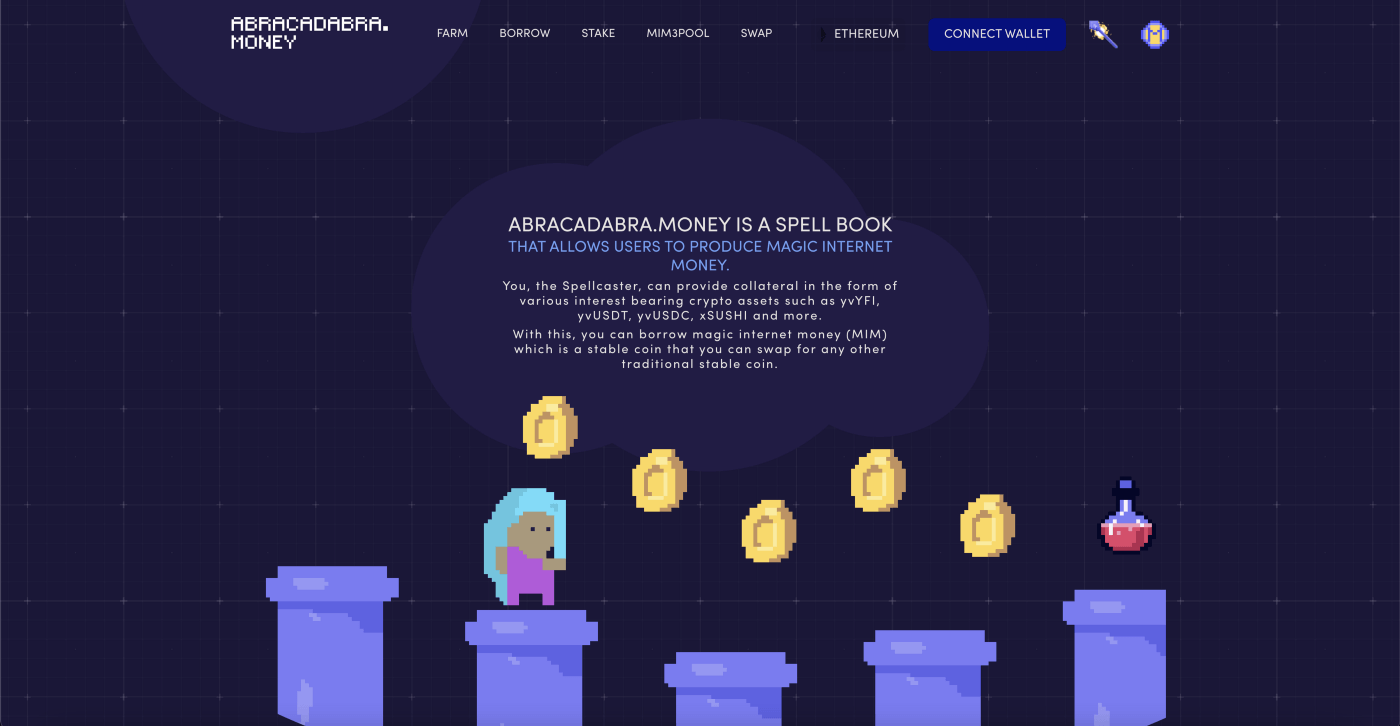 Abracadabra money is a multi-chain protocol that aims to create a DeFi native stablecoin called Magic Internet Money (MIM). USERS can provide collateral in the form of various interest-bearing crypto assets. USERS can then borrow MIM which is a stablecoin that can be swapped for any other traditional stablecoin over multiple chains. USERS who provide liquidity to the protocol or borrow from it can be often incentivized by SPELL tokens (the governance token for abracadabra.money) to attract more liquidity on multiple chains.