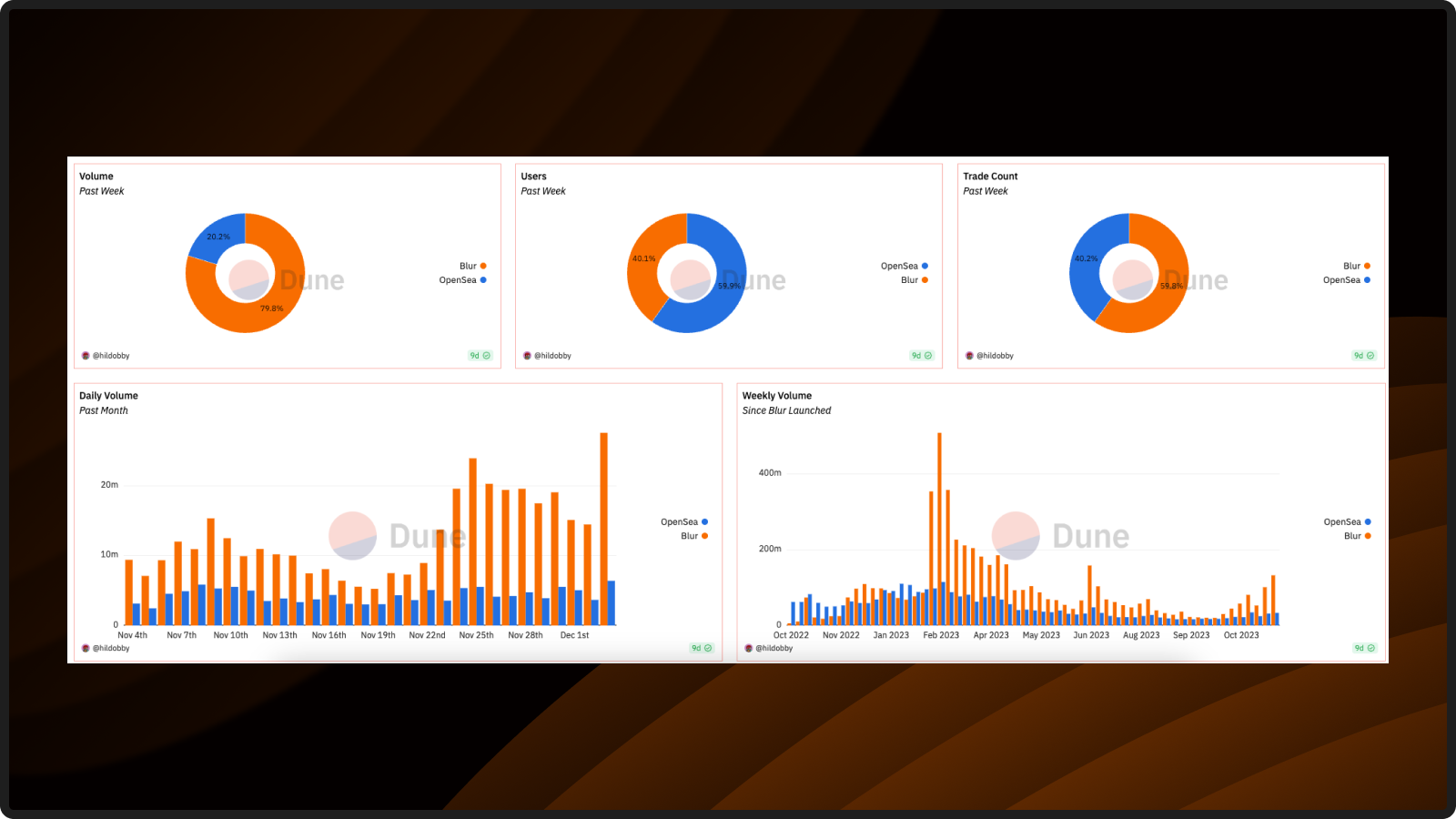 As presented by the Dune dashboard below, aptly called, ‘BLUR vs. Opensea’ by Hildobby, it is prevalent that BLUR has been actively taking a huge chunk of the NFT market share, showing dominance in daily volume when compared to its competitors.