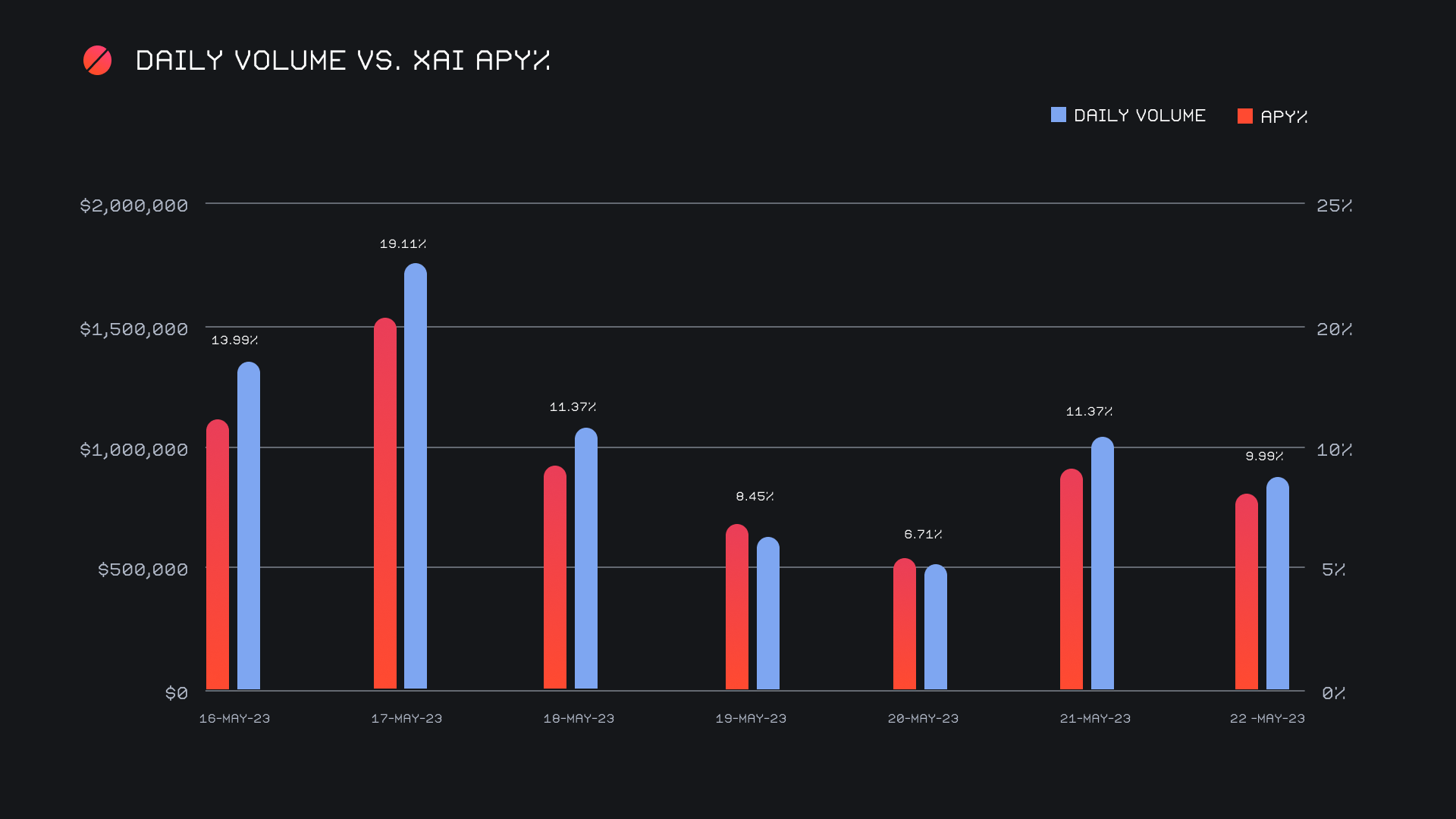 XAI stakers were rewarded with an average APY of 11.17% this week, with a daily rewards high of 47,561.58 XAI (an APY of 19.11%) being distributed to our staking vault on May 18th, 2023. This was following a daily volume of $1.8m. As a whole, this week XAI stakers received a total of 207,460.70 XAI, or $24,731.98 USD in staking rewards.