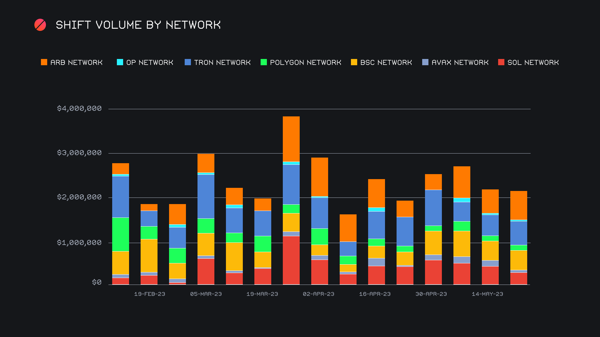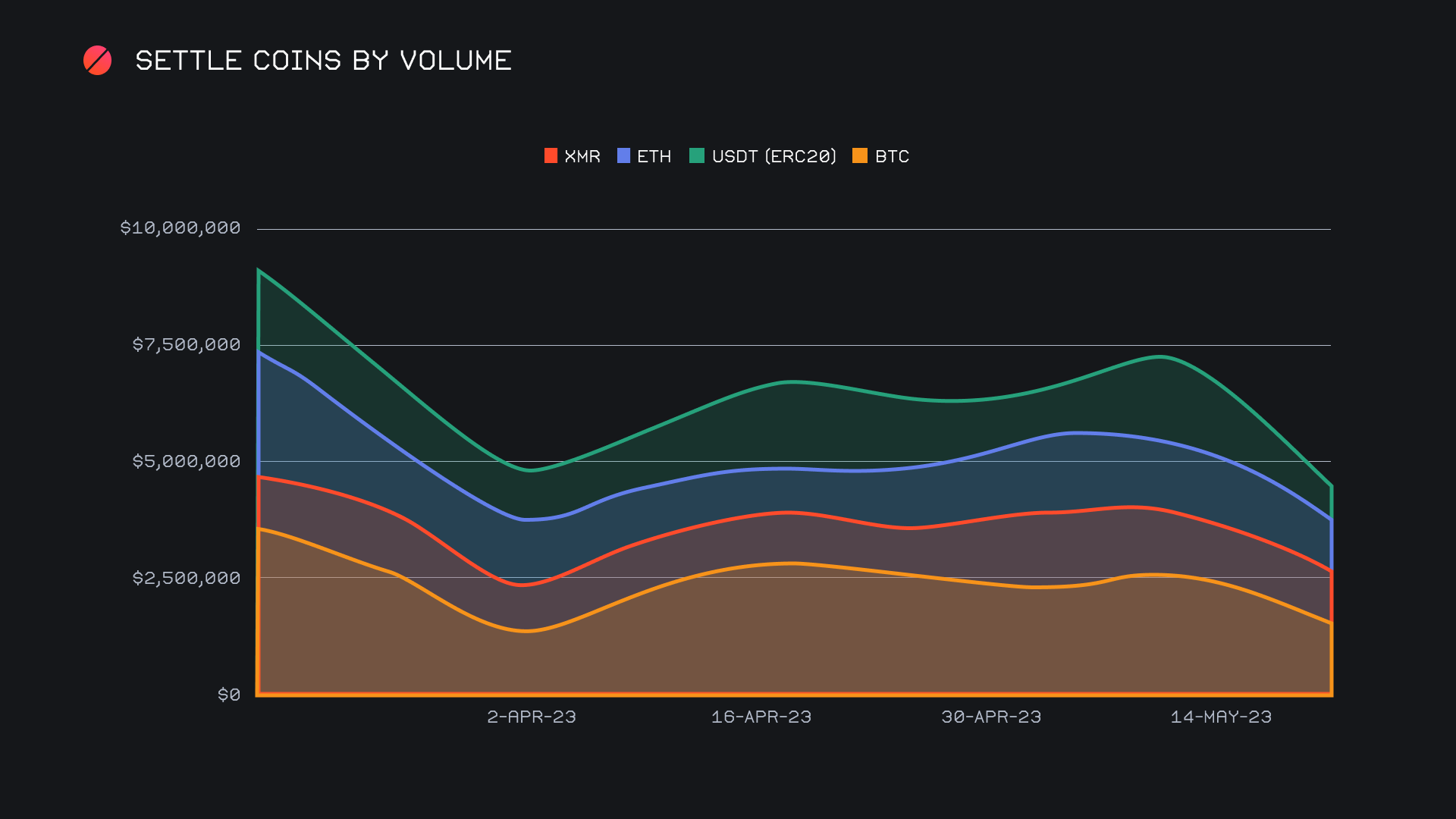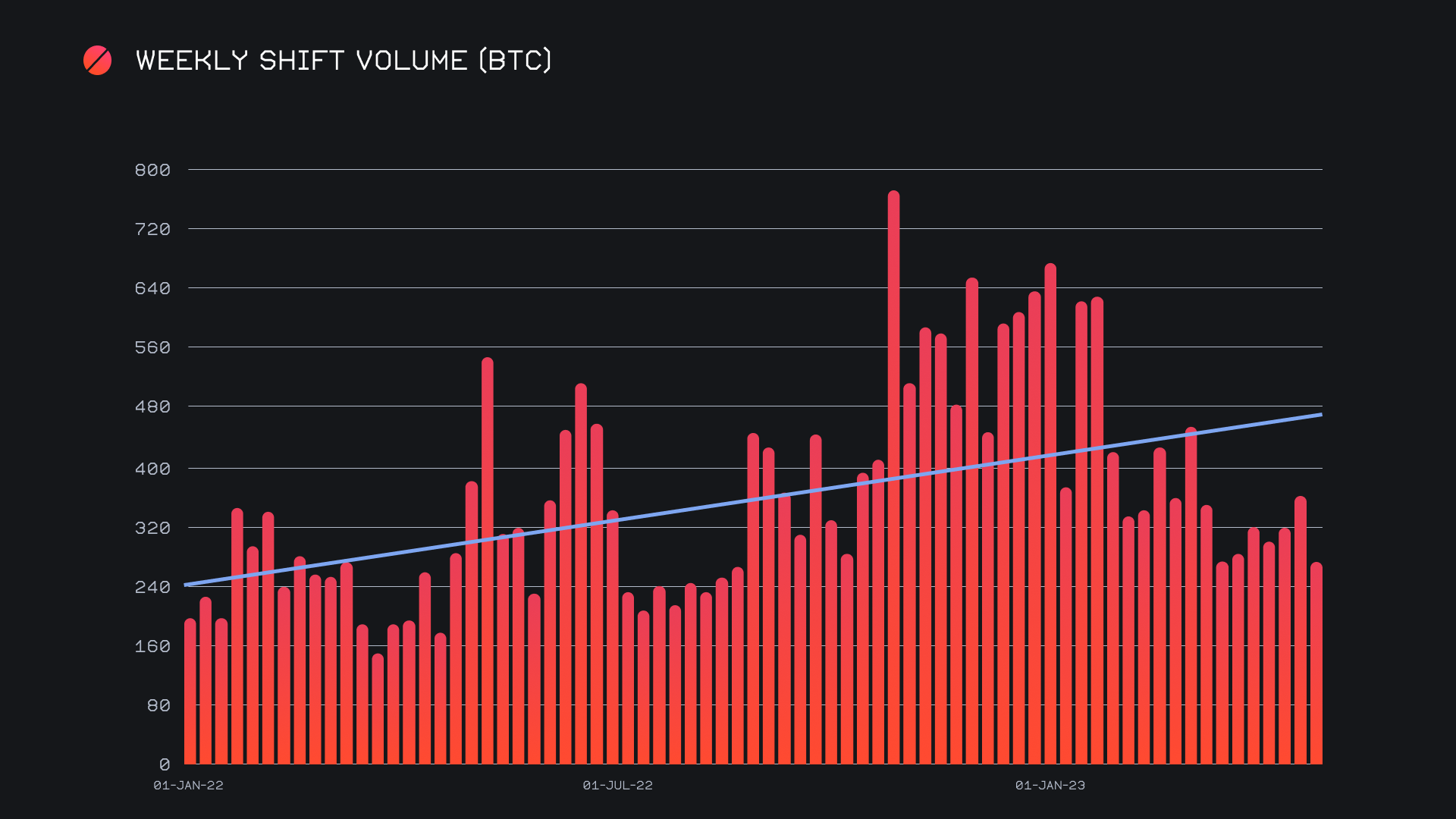 Despite little price action throughout the broader market, SideShift finished the period with a gross volume of $7.3m (-25.5%) alongside a shift count of 6,583 (-5.1%). These figures combined to produce daily averages of $1.04m on 940 shifts, thereby maintaining the $1m per day benchmark which we have sustained thus far in 2023. When denoted in BTC, our weekly volume amounted to 268.94 BTC (-24.9%).