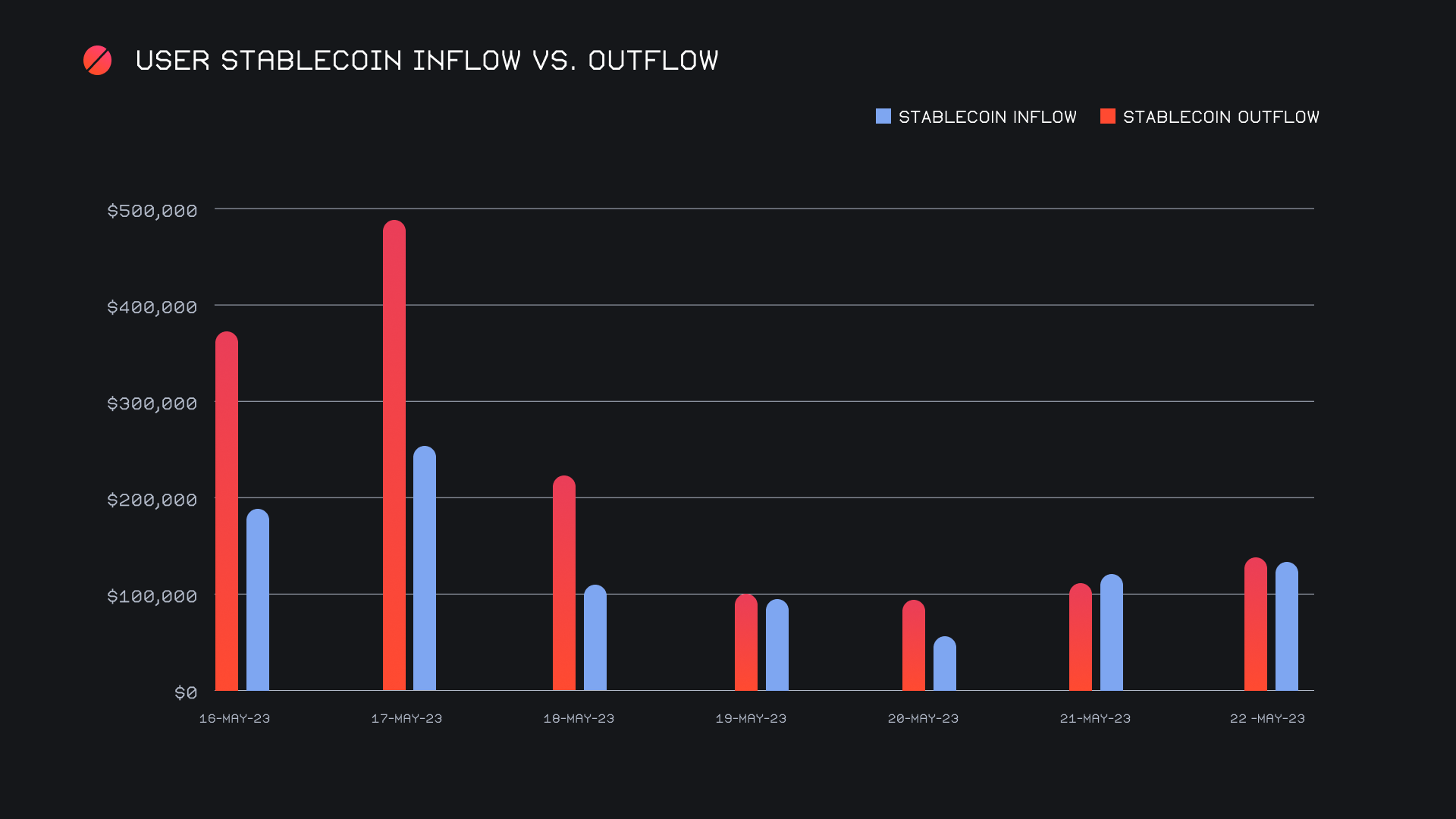 Although these two coins proved to be exceptions, the rest fell victim to the overarching declining trend. Both the inflow and outflow of total stablecoin volume decreased this week, albeit, with stablecoin outflow decreasing to a larger extent. What this means is that there was less demand for stablecoins when compared to the previous week, but this demand still exceeded the supply. This was mostly due to two days of heavy USDT (ERC-20) settlements, as seen on May 16th and 17th. Because of this, we ended the week with a net outflow of -$404k, a decrease of approximately $408k from last week.
