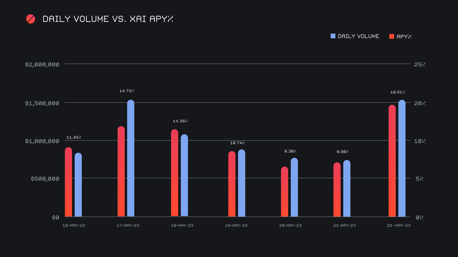 XAI stakers were rewarded with an average APY of 12.59% this week, with a daily rewards high of 46,764.97 XAI (an APY of 18.51%) being distributed to our staking vault on May 30th, 2023. This was following a daily volume of $1.5m. This week XAI stakers received a total of 224,877.73 XAI, or $25,377.23 USD in staking rewards.