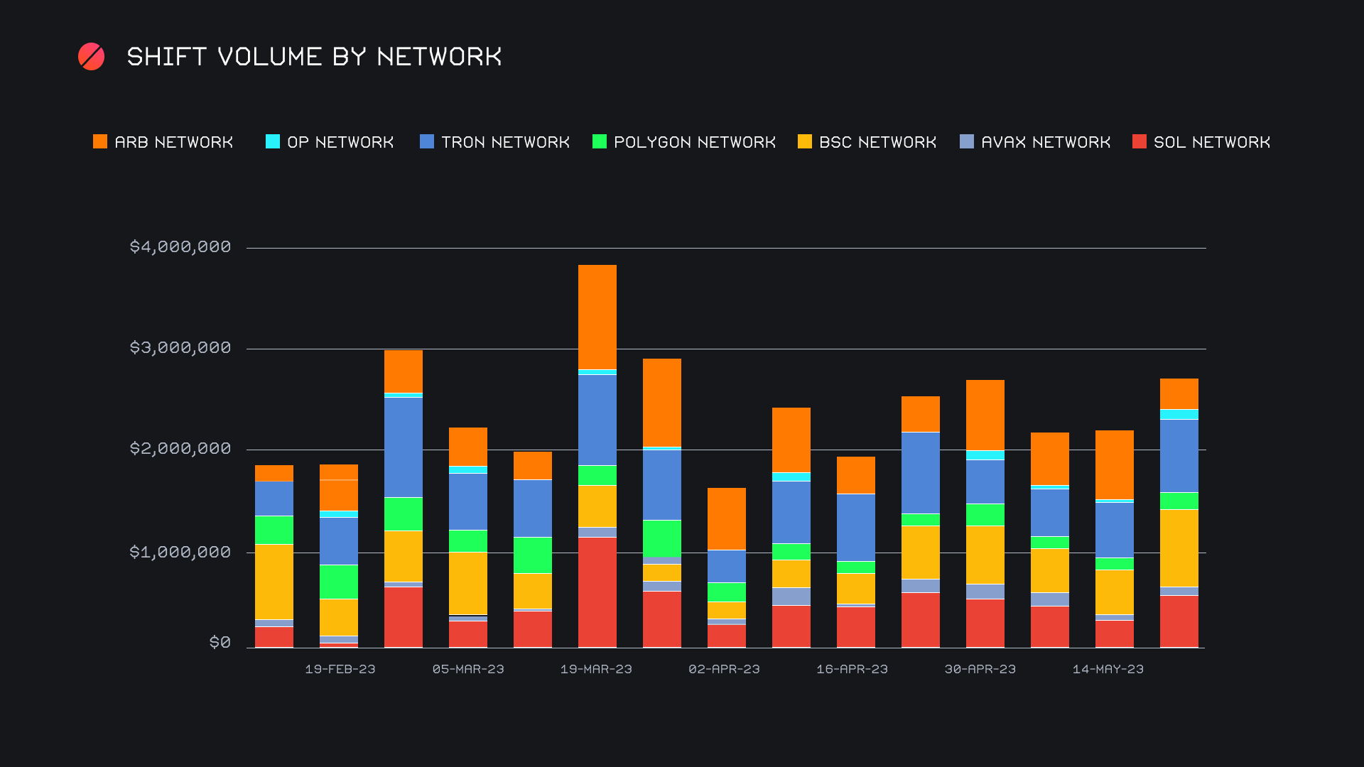 Alternate networks to Ethereum had a very strong week, achieving the highest cumulative weekly volume in the previous 2 months, with $2.7m. Partially thanks to the aforementioned shift pair, the Binance Smart Chain network shot up 74% to seize first place with $775k. This was enough to surpass the Tron network, which still finished with a respectable $719k (+33%). The SOL network also saw sizable growth in shift action, increasing 75% for a third placed finish with $581k. In fact, all alternate networks saw double-digit growth percentages, with the exception of the Arbitrum network, which fell off sharply. Total Arbitrum shifts plummeted 54.3% and finished with $286k after seeing three consecutive weeks above the $500k mark. A decrease in USDC on ARB shifts played a key role in this general decrease. All together, alternative networks to Ethereum made up 36.5% of the total volume on SideShift, which is a healthy increase from last week’s 29.4%, showing the continued popularity of these networks.
