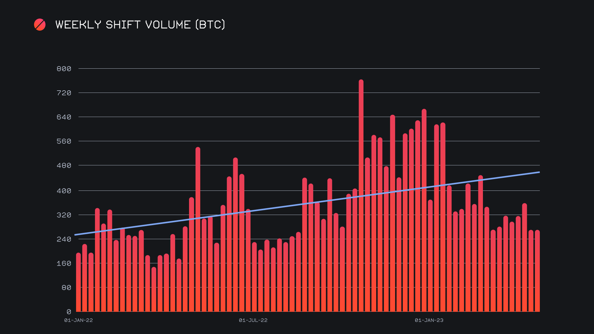 SideShift ended the week with a gross volume of $7.4m (+1.9%) alongside a shift count of 6,850 (+4.1%). Although fairly on par with totals seen last week, it should be noted that these numbers were achieved with a near 20% decline in liquidity shifting - this means that user volume actually increased by a decent amount. Together, these figures combined to produce daily averages of $1.1m on 979 shifts. When denoted in BTC, our weekly volume amounted to 247.04 BTC (+1.9%).