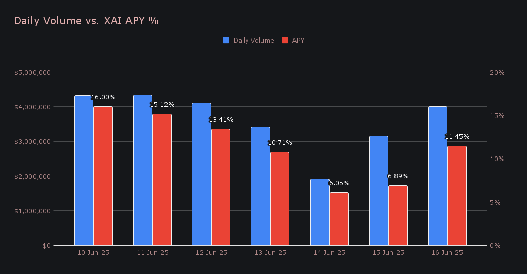 - XAI staking rewarded 278,462 XAI ($43.9k) – peak 16.00% APY on June 11th, following $4.32m in daily volume.