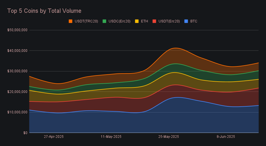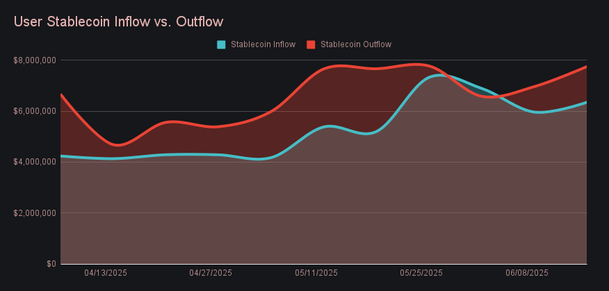 Stablecoins dominated the remainder of the top five, occupying three of the four spots behind BTC. USDT (ERC-20) led the group with $8.50m in total volume (+20.5%), supported by balanced activity across both sides - user deposits rose +9.0% to $2.69m, while settlements climbed +29.9% to $3.38m. USDC (ERC-20) followed with $4.19m (+22.0%), buoyed by strong settlement flows, and USDT (TRC-20) returned to the leaderboard with $3.83m (-3.4%) despite mild declines across the board. The rise of these stablecoins came at the expense of SOL, which dropped -10% to fall out of the top five after a multi-month run. Regarding stablecoins in general, users are marginally favoring withdrawals into stables, network preferences are steady with Ethereum and Tron dominating, and volumes are down a touch from the late-May bump, but ultimately steady. This week’s net stablecoin flow furthered the ongoing trend with outflows exceeding inflows, and finished at -$1.40m.