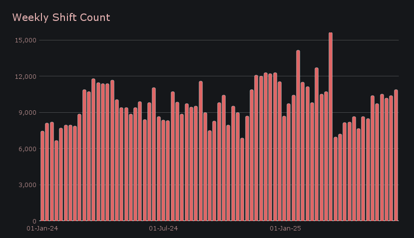 Shift count climbed to 10,891, a +4.7% increase that represented our highest weekly total since March 2025. On a daily basis, the platform averaged 1,556 shifts and $3.60m in volume, with both metrics finishing well above year-to-date averages, +7.9% and +20.1%, respectively. Activity remained well-distributed, showing no single-day spikes but instead a steady cadence throughout, suggesting consistent user engagement across the board.