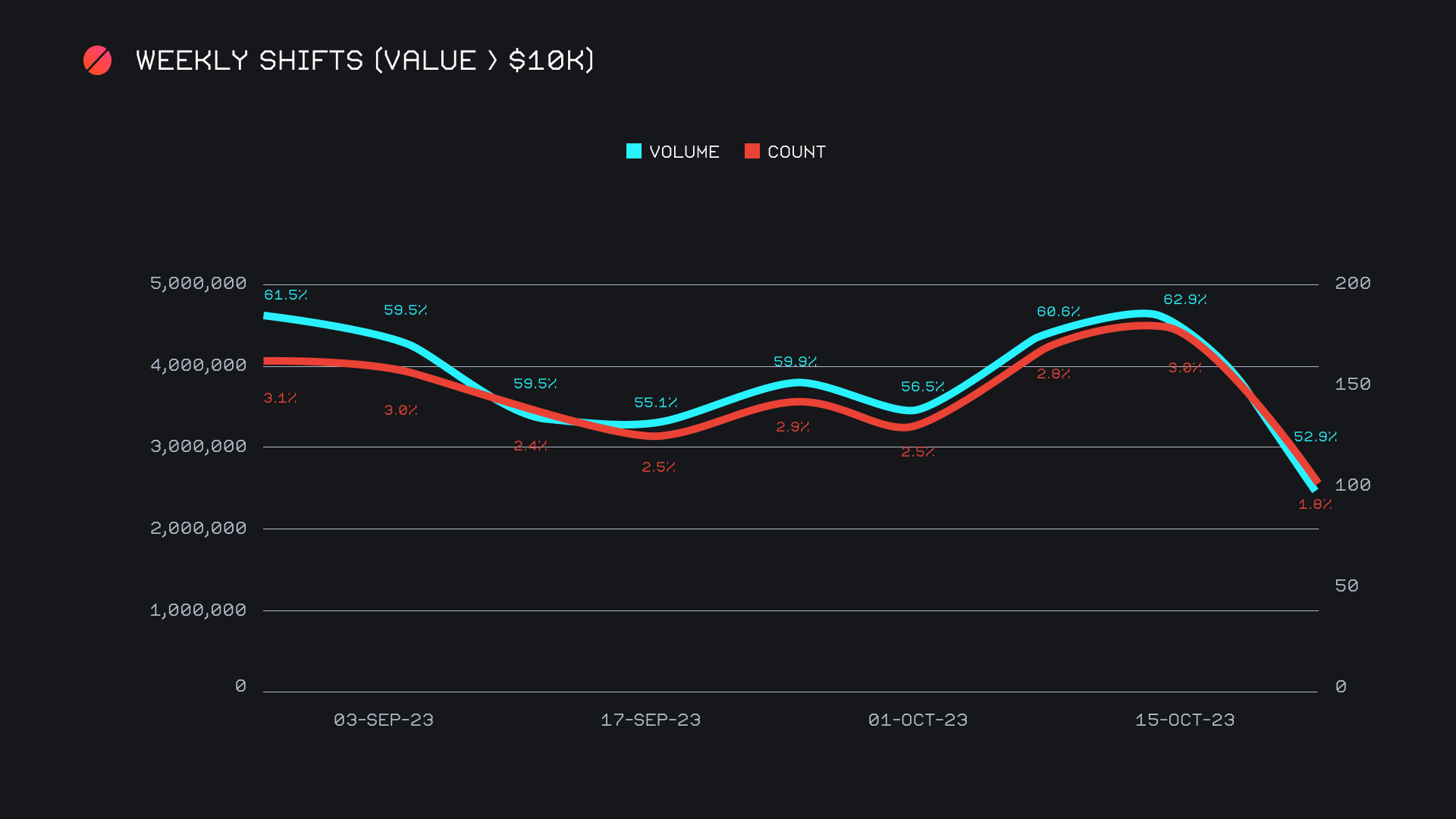 One of the key reasons for the volume decline noted this week was the lack of whale shifting that took place. To analyze this, we looked at shifts with a value greater than $10k over the course of the past two months and charted both their volume and shift count on a weekly basis. The percentage labels represent the proportion of the weekly total, for all shifts with a value >$10k. When charted like this, it is evident that there was a significantly lower amount of large shifts occurring, nearly 40% less than the 2 month average. This circles back to the idea that shifting occurs in waves, and most commonly surges during periods of volatility.