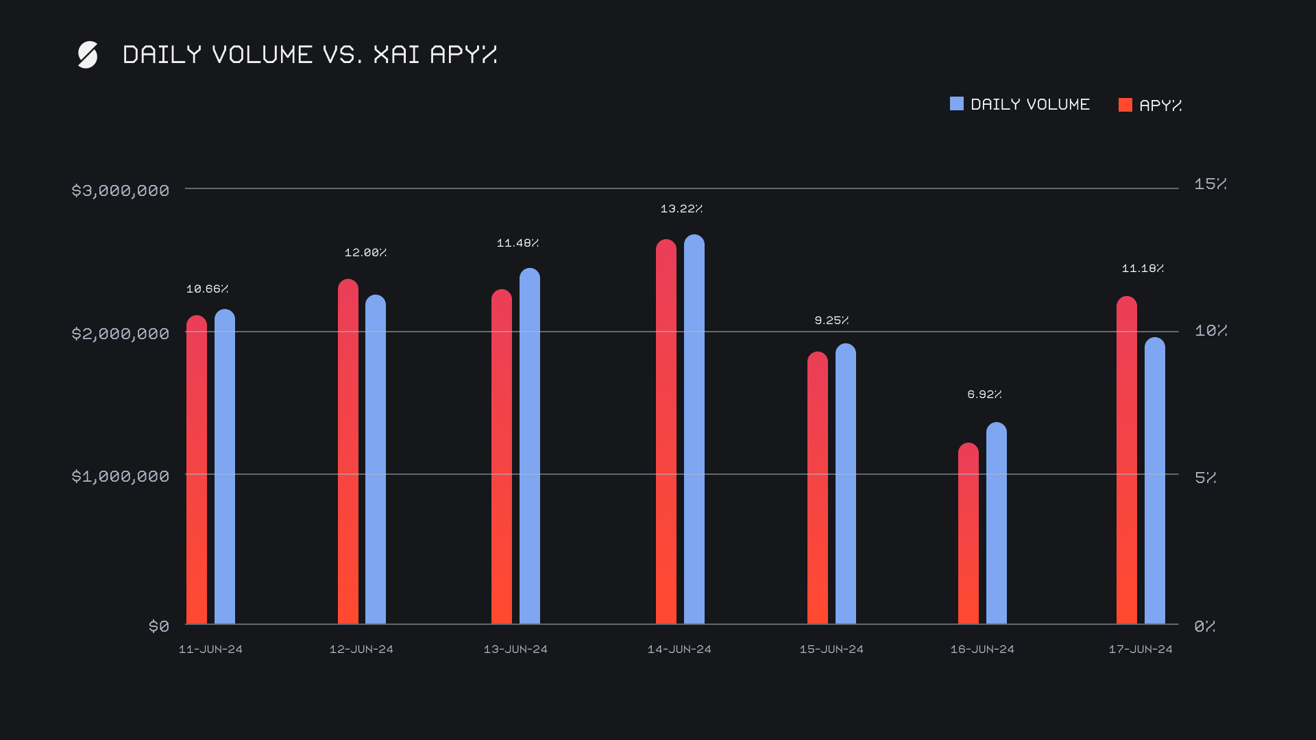 XAI stakers were rewarded with an average APY of 10.67% this week. The highest daily reward distributed to our staking vault amounted to 41,195.6 XAI (equating to an APY of 13.22%), and was deposited on June 15th, 2024, following a daily volume of $2.7m. This week, XAI stakers received a total of 235,106.21 XAI or $40,720.40 USD in staking rewards.The price of 1 svXAI is now equal to 1.3435 XAI, representing a 34.35% accrual on stakers investments. A friendly reminder that the easiest way to participate in XAI staking is to make a shift directly to svXAI, from any coin of your choice.