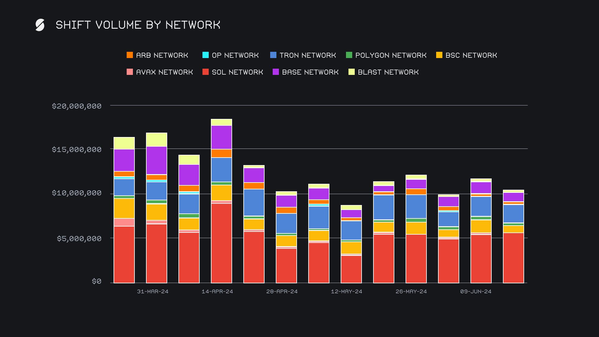 SOL ranked third overall with a total volume of $4.3m, experiencing a -10.0% decline from the previous week. Deposit volumes for SOL saw a fairly significant drop of -25.4% to $1.3m, while settlements also decreased by -7.2% to $2.0m. This decrease in deposit volume came from a lack of SOL/ETH shifting, which had ended the previous three consecutive weeks as the top shift pair among users. In spite of these declines, SOL still remains a popular choice for users and has surpassed $4m in total weekly volume for over a month. ETH <> SOL shifting remains notable, with ETH/SOL ending the week as our second most shifted pair with a volume of $880k.