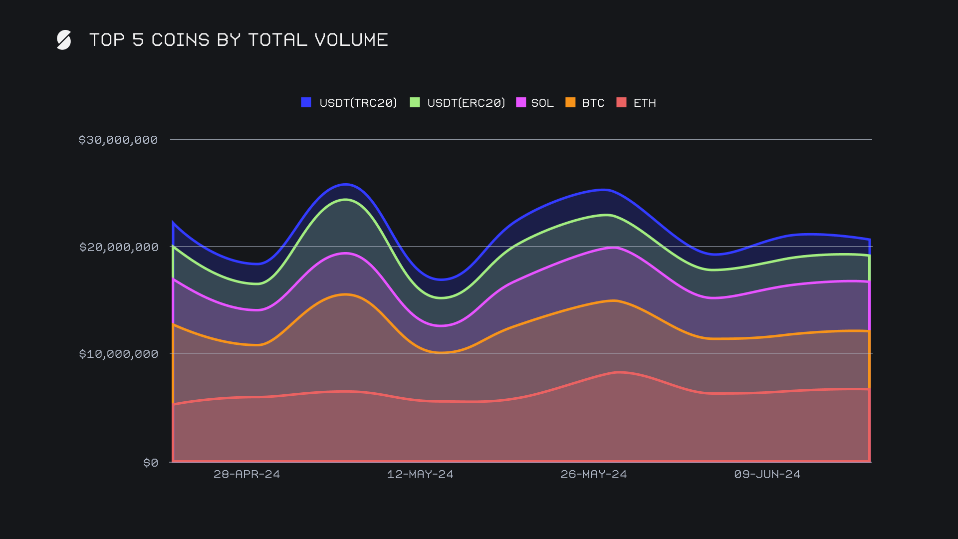 BTC followed with a respectable total volume of $5.3m, showing a modest +3.2% rise. The recent trend of users preferring to deposit BTC and receive other top coins such as ETH and SOL continued, as BTC topped all other deposit coins with a $2.5m sum (+3.2%). Conversely, BTC user settlements sat $1m lower at a total of $1.5m (+3.2%), which was only enough to finish as our third most demanded coin, behind SOL.