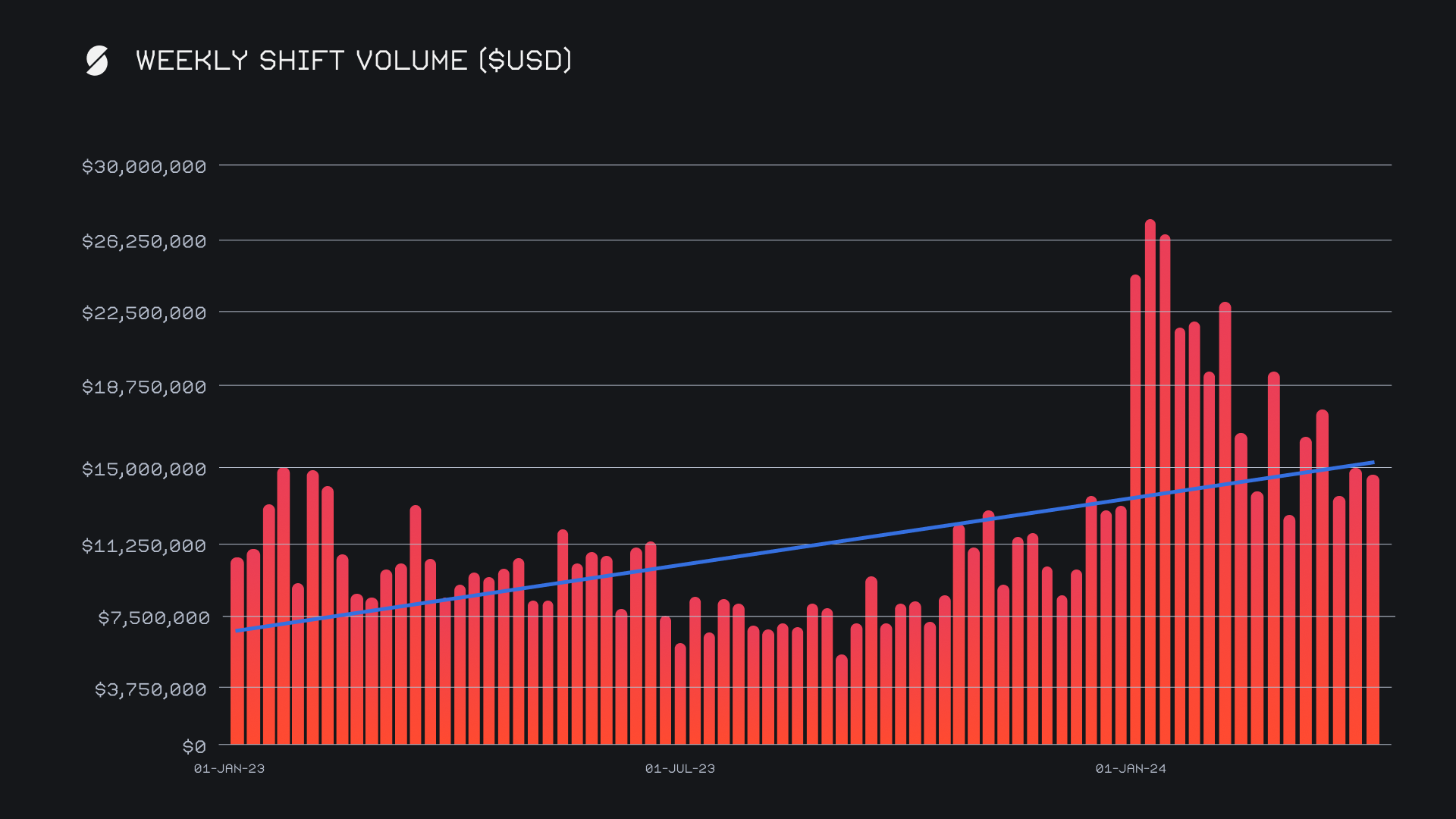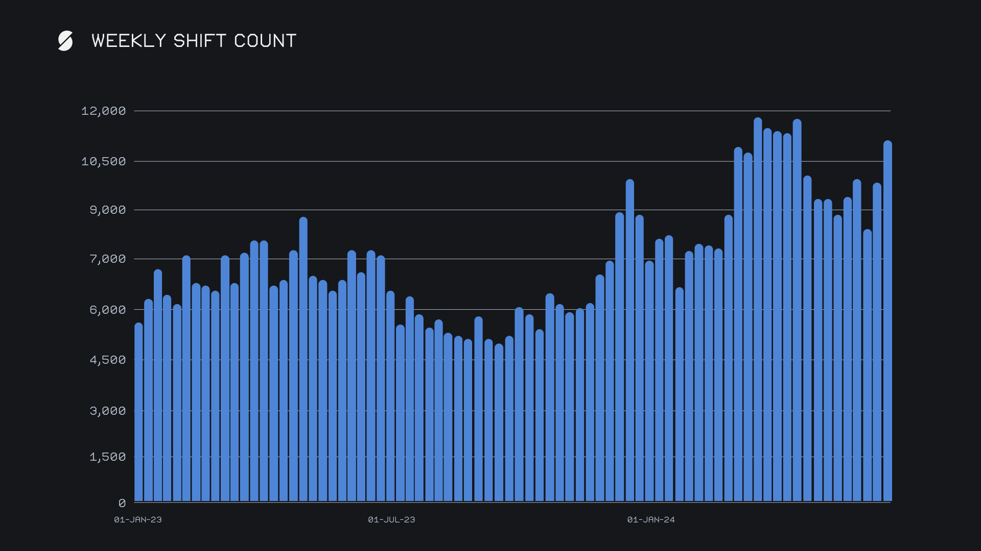 Despite the slight decline in weekly volume, SideShift saw a strong increase in shift activity, with our gross weekly count rising by +12.3%, for a total of 11,026 shifts. This sum approaches our all time record for shift count and is just the 6th time our weekly count has exceeded 11,000 - the rest occurred consecutively from late March to early April 2024. While weekly volume can be more volatile, shift count in 2024 so far has clearly been robust, as displayed in the chart below. Together, our volume and sum combined to produce daily averages of $2.1m on 1,575 shifts.