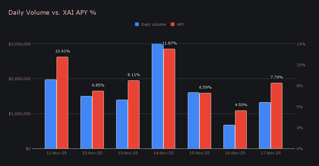 Stakers earned a total of 208,629.53 XAI ($24,661.75), with the average APY landing at 8.09%. The most active day was November 14th, when 43,119.83 XAI was distributed directly to the staking vault at 11.87% APY, supported by $3.12m in daily volume, occurring alongside market volatility. Activity across SideShift increased, but rewards ended below last week, offering a slight divergence between the rise in user activity and the level of distributions.
