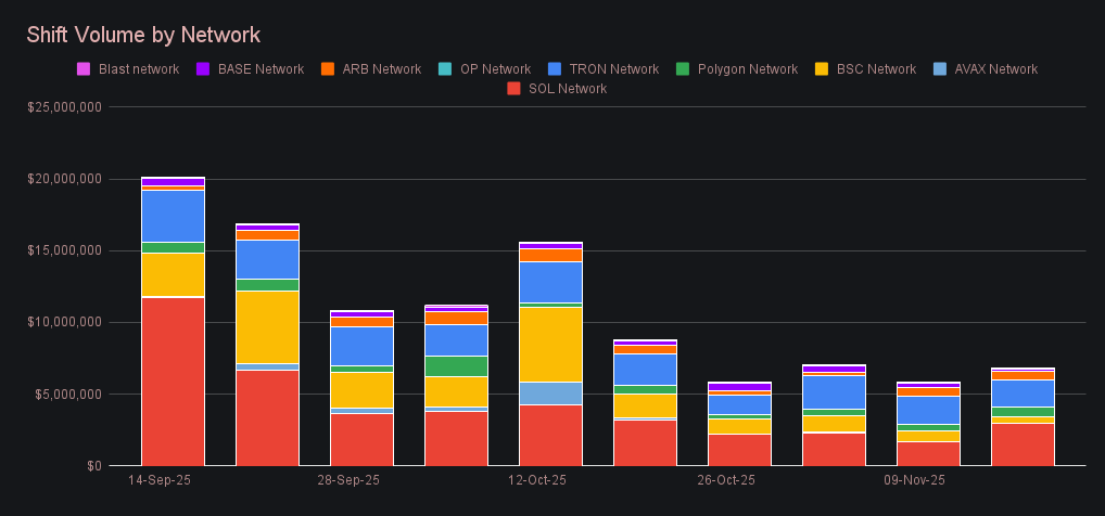 SideShift meanwhile recorded its third consecutive period of growth, capitalizing on the heightened market volatility to push weekly volume to $11.57m (+7.6%) even as broader conditions remained under pressure. User shifting reached $8.05m (+4.4%), led by BTC-deposit-side activity across this week’s top user pairs — BTC/USDC (ERC-20) at $426k, BTC/ETH at $379k, and BTC/SOL at $331k. This concentration of BTC inflows set much of the week’s flow pattern and created a clear imbalance, which in turn increased liquidity shifting that added an additional $3.52m (+15.5%) to the total weekly volume.