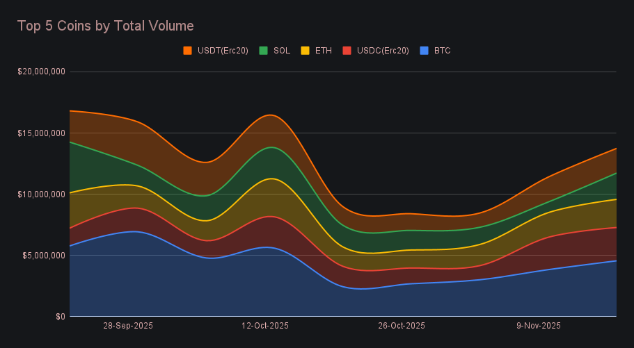 BTC came in at $4.57m (+18.8%), extending its four-week climb and again seizing the biggest share of overall activity. User deposits reached $2.22m (+18.2%), while settlements fell to $631k (−23.5%), continuing the recent pattern where BTC shows up far more on the inbound side than the outbound. A notable addition this week was L-BTC, which surged +144% to $1.35m and finished seventh overall, giving BTC-related shifting an extra push and contributing meaningfully to the broader rise in weekly volume. The dynamic was less one-sided than last week, but the direction was the same: users were selling BTC far more often than buying it.