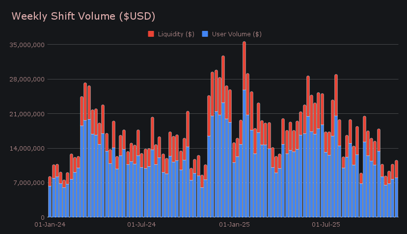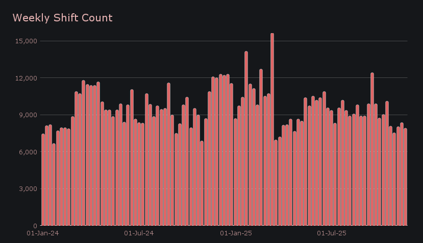 Shift count declined to 7,915 (−5.3%), but the lower number of transactions came alongside a clear rise in average shift size, most notably from major integrations. This helped keep overall activity robust, with daily volume averaging $1.65m and the daily count holding at 1,131. The pattern suggested that users responded to the week’s volatility by shifting less frequently but with meaningfully larger size whenever they stepped in.