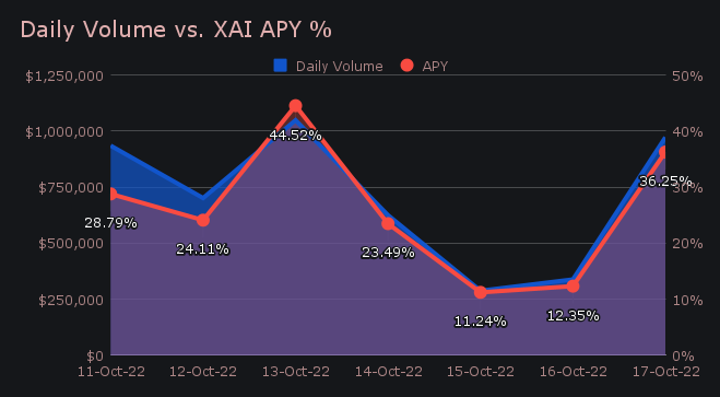 SideShift had a decent but steady week, with volume being quiet over the weekend (as is normally the case). For stakers, this resulted in lower reward payouts on Saturday and Sunday, but despite that, there was a healthy weekly APY. It averaged 25.82%, with a weekly reward high of 38,477.22 XAI being paid to our staking vault on October 14th, 2022. This was following a daily volume of $1.05m.