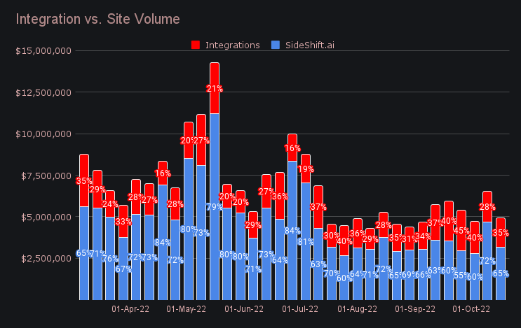 All in all, integrations represented 35% of SideShift’s weekly volume, which marked a 7.1% increase from last week. They combined for 42.5% of shift count, which happens to be the exact same proportion of count as last week.