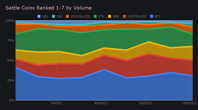 Similar trends were noted on the settle side. BTC retained its position as the most settled coin with $1.25m, while ETH fell in this category as well. USDT on Ethereum ($787k) and XMR ($699k) rose to claim second and third, both overtaking ETH, which saw its settlements drop 59.6%. It finished in fourth with $621k.