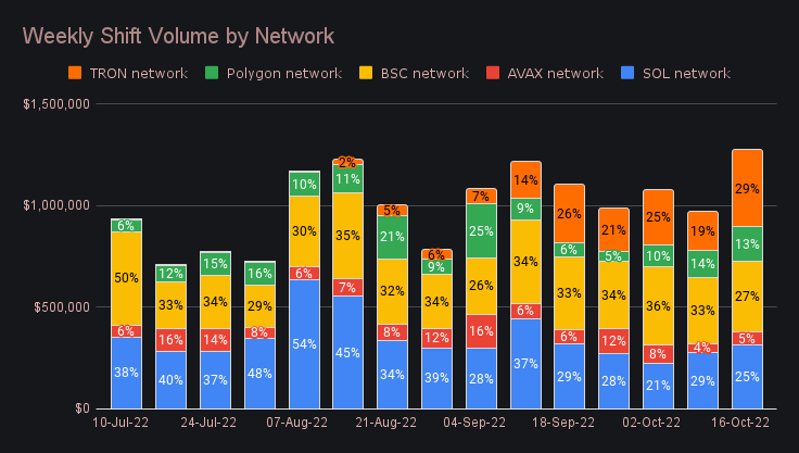 The Tron network continues to perform well, this week representing the highest proportion of volume from EVM chains, aside from ETH. It has achieved this feat in just its 10th week since listing. This growth is mainly due to the increased popularity of USDT on Tron, which has only just had its 7th week on SideShift. You can see the volume growth of the network in the chart below. Despite capturing the highest weekly EVM volume (besides ETH), the TRON network still sat behind Binance Smart Chain, and the Solana network when measuring shift count. Still, it is quickly closing in on Solana in this regard.