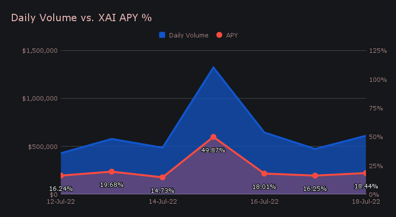 SideShift averaged a healthy APY of 21.89% this week, with a daily APY high of 49.87% (37,448.91 XAI) being distributed to stakers on July 16th, following a volume of $1.32m.