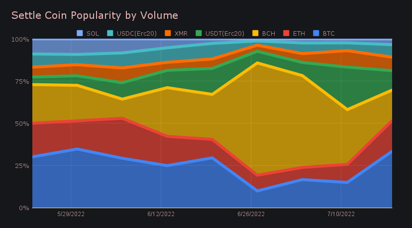 These data points combined with a further 4% drop in the volume percentage of our top 3 settle coins, which this week measured 61.7%, indicate that our volume has begun to trickle outwards, and is no longer heavily concentrated as it was throughout the previous month.