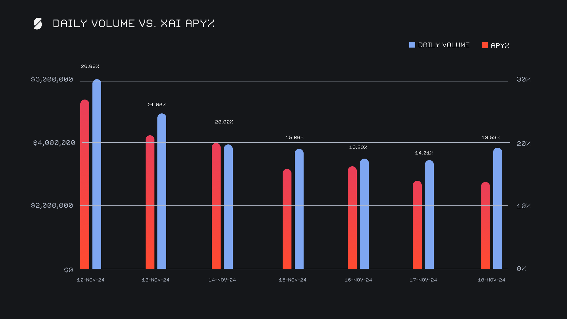 XAI stakers saw strong returns throughout the period, with an average APY of 18.23%. The highest daily distribution occurred on November 13, 2024, when 82,554.92 XAI was sent directly to our staking vault, corresponding to a weekly APY peak of 26.89%. The solid APYs were the byproduct of SideShift’s record setting week, achieving all time highs in both weekly volume and shift count. Altogether, XAI stakers received a total of 402,415.07 XAI or $65,553.41 USD in rewards, showcasing the ongoing appeal of participating in XAI staking.
