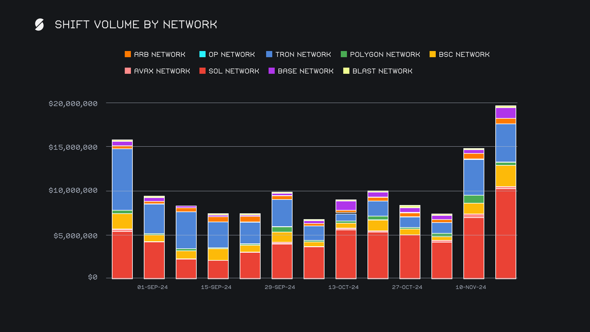ETH followed in second and reached a total volume of $10.4m, a solid +29.1% increase from last week, and breaching the $10m mark for the first time in 6 weeks. It had a fairly balanced split between user deposits and settlements, with deposit volume climbing +64.5% to $3.8m, and settlement volume growing by a more moderate +8.3% to $3.7m. This surge in deposits suggests that users were looking to escape ETH’s slow price action and move into high-momentum assets like SOL, as it soared to near all-time highs - this trend was underscored by resurfacing of week’s most popular shift pair, ETH/SOL.