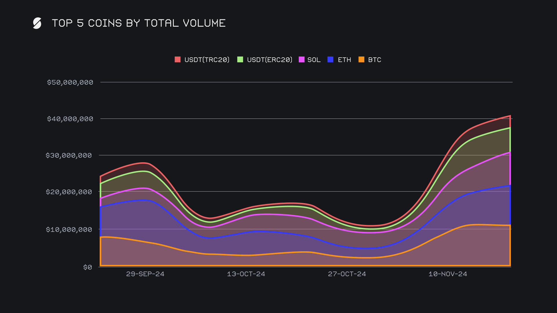 Beyond the top 3 coins that led the week, our record-breaking volume was further backed by noteworthy performances from a range of other assets. DOGE made quite the impact, with its volume surging over 25x from just two weeks ago to reach $1.4m, signaling a renewed wave of user interest. ETH (BASE) also stood out, achieving significant growth with its volume jumping +220.4% to $1.1m. Interestingly, among our top 10 coins, it was only stablecoins USDC (ERC20) and USDT (ERC20) which noted declines, primarily due to a lack of demand from users. Respectively, settlements for these stablecoins totaled $2.5m (-18.1%) and $560k (-11.6%), a bullish indicator that SideShift users are less inclined to hold stablecoins for the time being. Overall, all of SideShift's top 10 coins surpassed the $1m total volume mark, showcasing strong activity across the platform and broad-based interest from users.