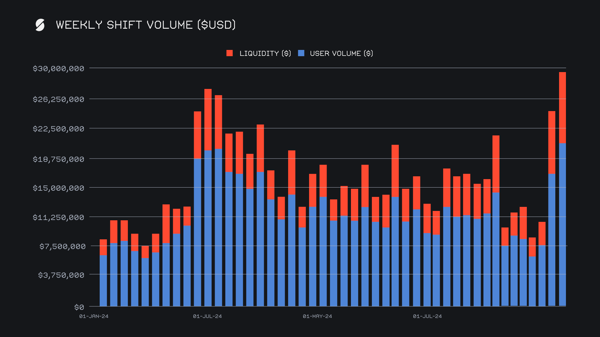 SideShift delivered an outstanding performance and achieved a record-setting gross weekly volume of $29.4m, a notable +19.2% increase from last week, marking the highest ever recorded on the platform. User shifting volume played a key role and rose to $20.5m (+24.8%), while an additional $8.9m (+7.9%) in liquidity shifting was required to even out the imbalance of deposited assets. These numbers pushed our weekly total well above our YTD running average, with volume ending +87% higher. Daily averages remained robust, with $4.2m in volume alongside 1,723 shifts per day.