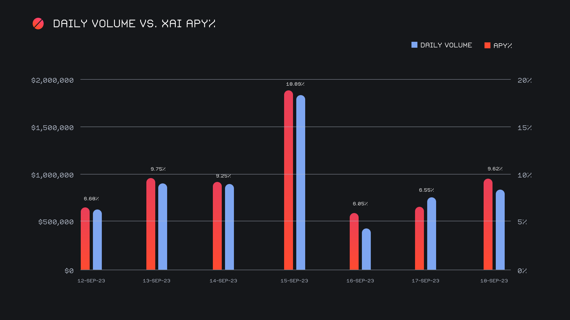 XAI stakers were rewarded with an average APY of 9.53% this week with a daily rewards high of 52,719.16 XAI or $4,579 (an APY of 18.89%) being distributed to our staking vault on September 16th, 2023. This was following a daily volume of $1.8m. This week XAI stakers received a total of 192,941.29 XAI or 16,392.29 USD in staking rewards.