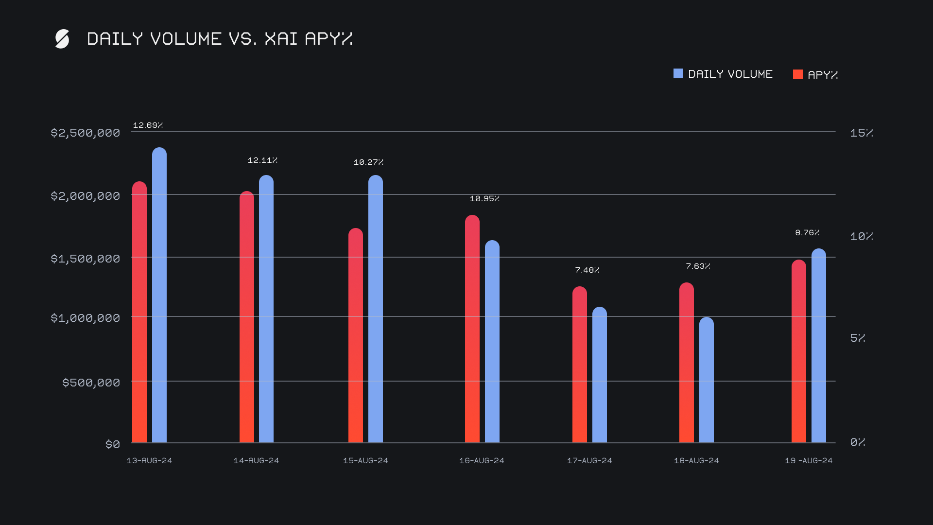 XAI stakers enjoyed a weekly average APY of 9.98%, with a notable daily rewards high of 40,243.39 XAI (equivalent to an APY of 12.69%) being distributed directly to our staking vault on August 14th, 2024, following a daily volume of $2.4 million. This week, XAI stakers received a total of 224,248.77 XAI, or $31,865.75 USD in staking rewards.