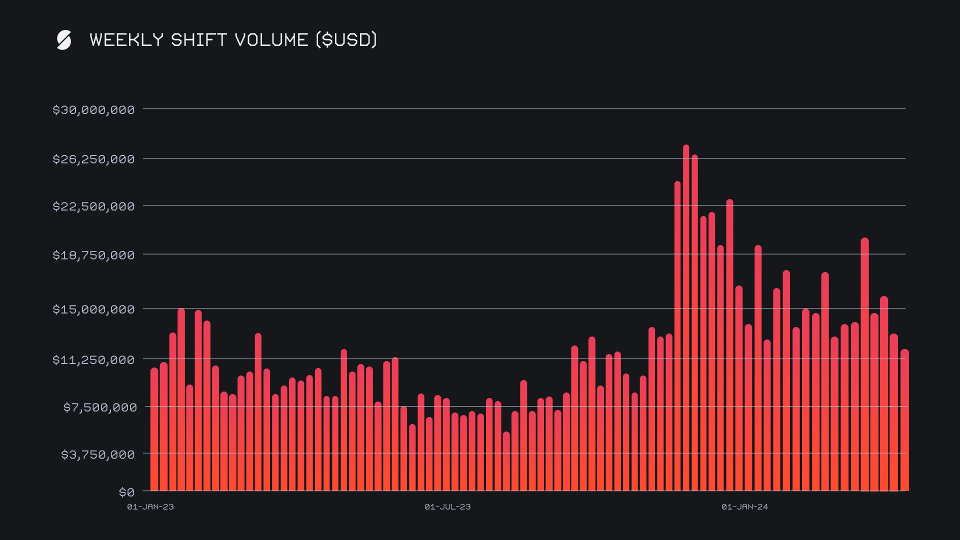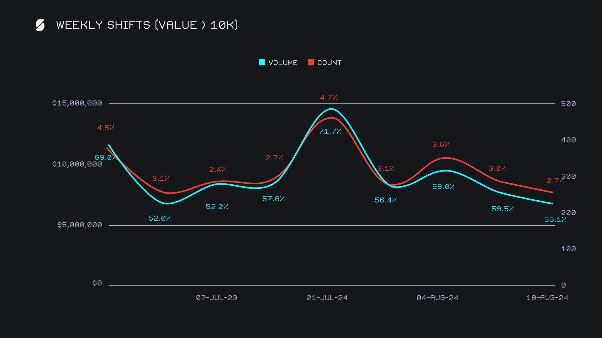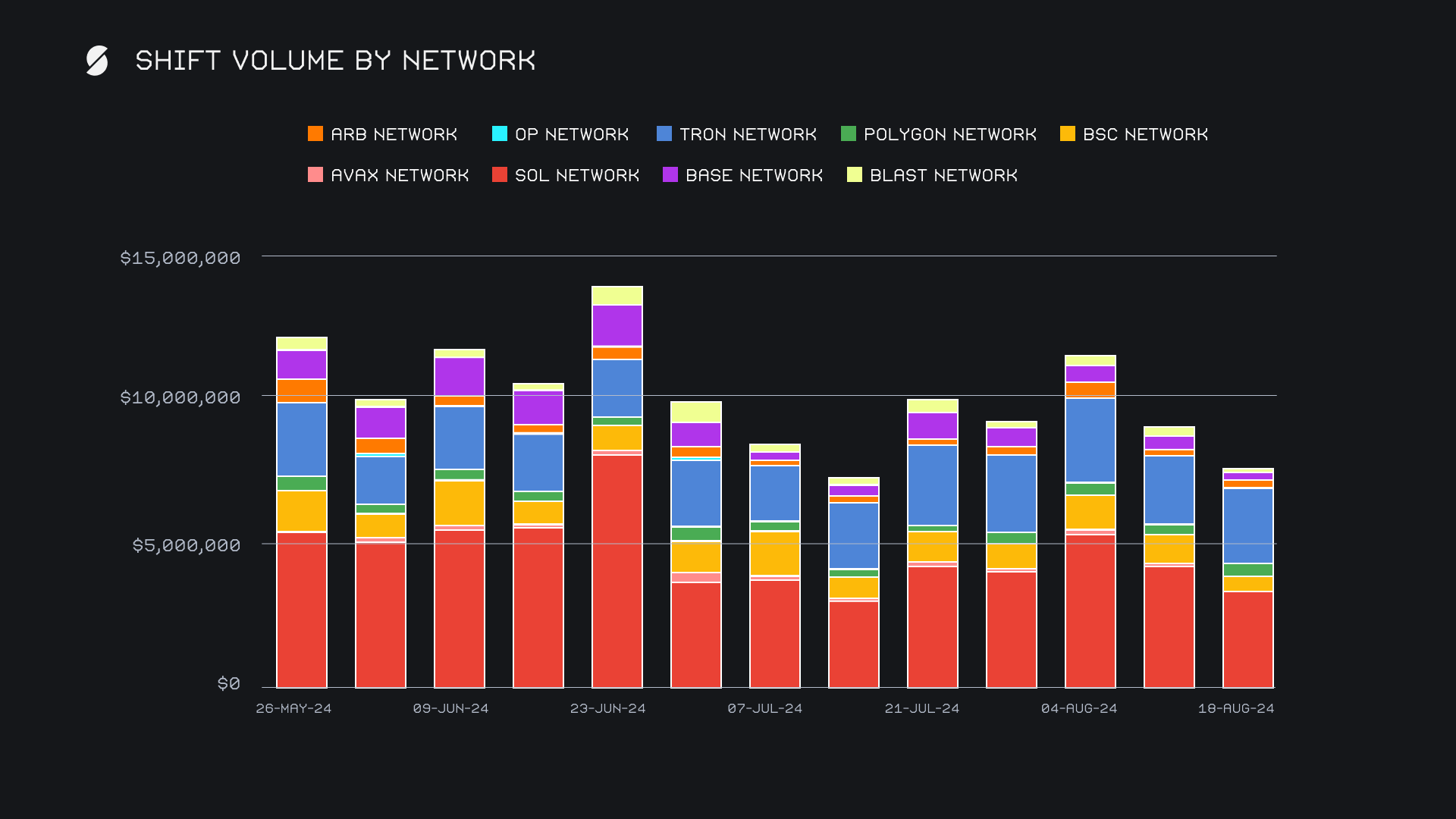 This week, SideShift recorded a gross volume of $11.9m, marking a slight decrease of -6.9% compared to last week. Despite the dip in volume, user activity remained stable, with the total number of shifts rising slightly by +0.7% to 9,496. The outcome were daily averages of $1.7m 1,357 shifts. This indicates that we saw on average a higher number of smaller scale shifts this week, while also seeing a lesser amount of whale shifts take place.