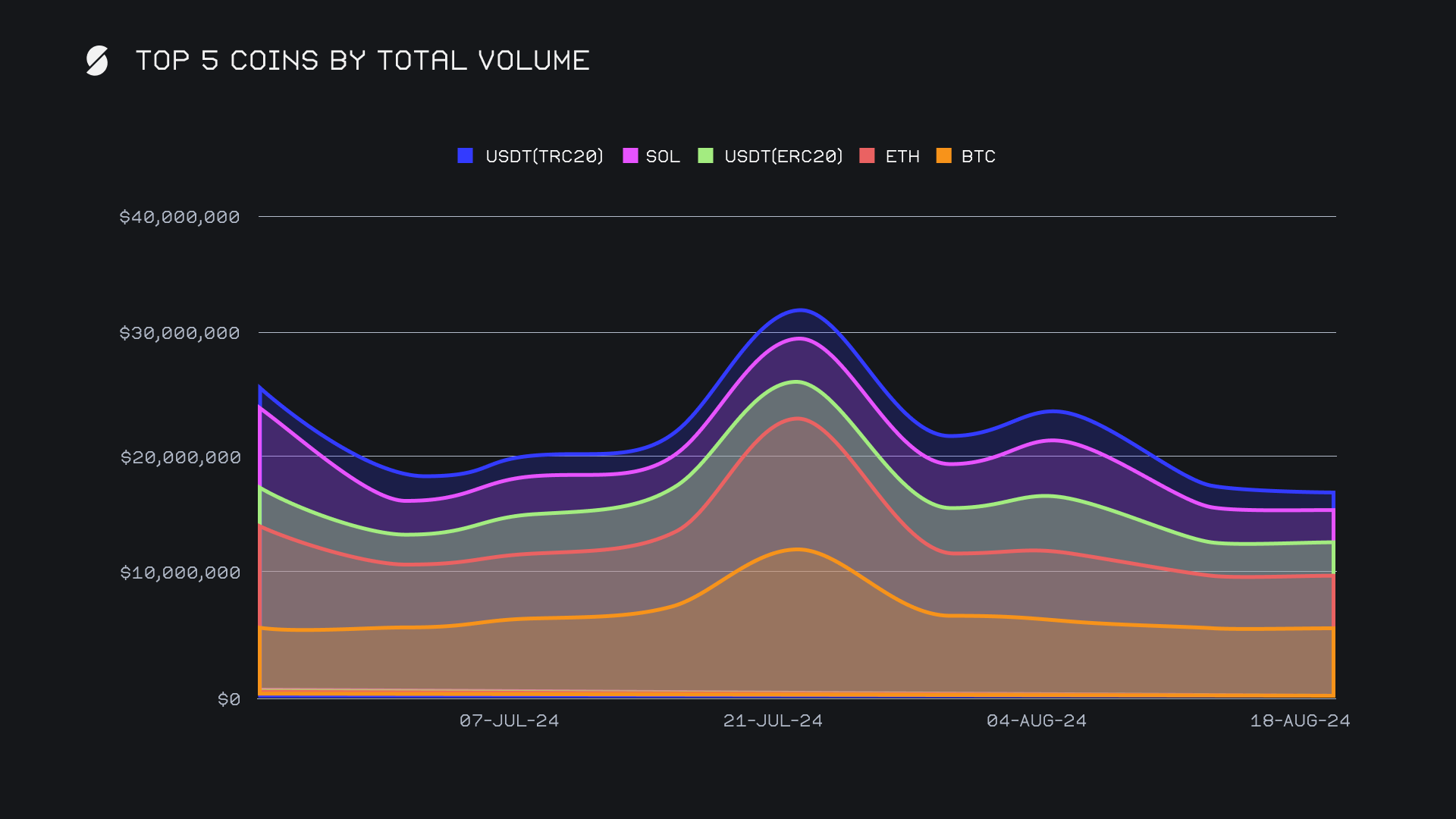 ETH held the second spot with a total volume of $4.2m, representing a modest increase of +4.7% from last week. However, this growth was not uniform across the board - deposits fell by -11.7% to $1.2m, while settlements surged by +9.9%, reaching $1.9m. This pattern opposed that of first placed BTC, and coincided with the return of the BTC/ETH shift pair. This placed ETH as SideShift’s most demanded coin this week, although remaining quite a bit lower than levels achieved in late July.