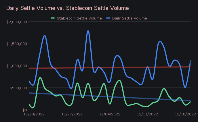 Interest in stablecoins remains low, as total stablecoin settlement volume continues to hover around the 23% mark. This is nearly 15% lower than the record highs reached only a couple of weeks ago. You can observe in the chart below that over the course of the past month the general trend for stablecoin settlements is tilted downwards. That being said, USDT on Ethereum did finish as the fourth most settled coin with $940k. Still, now for the second week it has finished with only half the settlement sum of our most popular coin, BTC. For the time being, it seems users are more interested in accumulating established coins such as BTC and ETH.