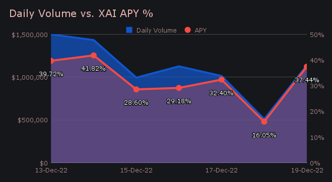 XAI stakers were rewarded with an extremely solid average APY of 32.17% this week. A daily rewards high of 54,383.76 XAI (yielding a 41.82% daily return) was deposited to our staking vault on December 15th, 2022, following a daily volume of $1.43m.