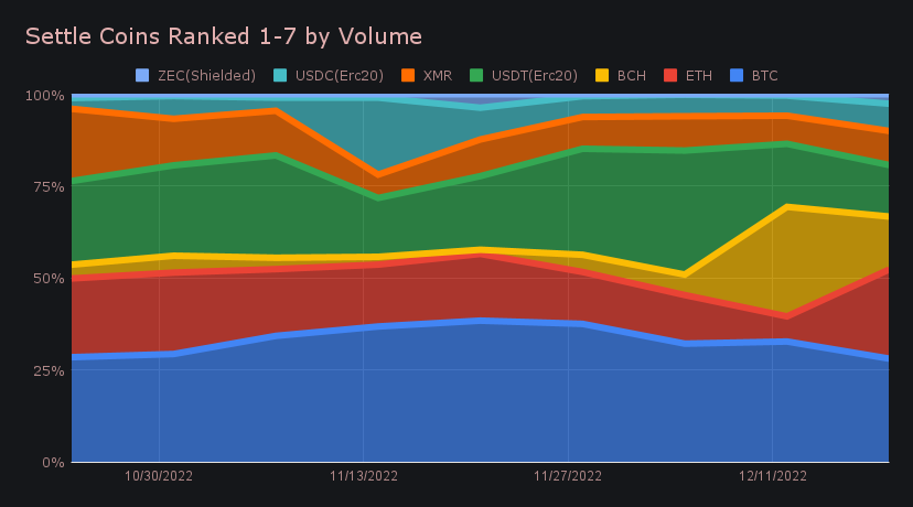 In particular, this came from the peculiar pair of ZEC (shielded) / ETH, which yielded $701k in shifts for the week. 92% of the deposited ZEC (shielded) settled to ETH this week, and arrived in large but steady chunks as the period progressed. In third place was BCH, which had a healthy settle volume once again, but fell short of the standout figure achieved last week. It dropped by 35.3% and netted a sum of $967k.