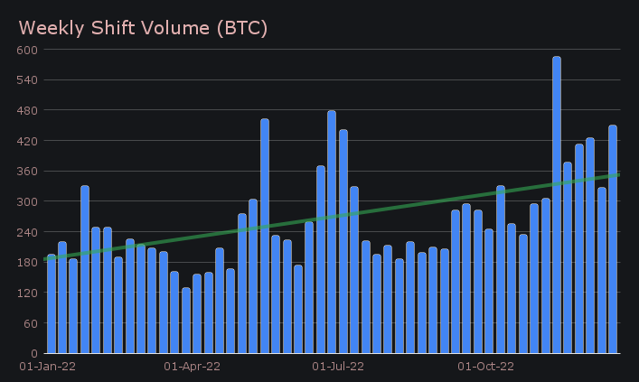 Despite the general sideways market movement, SideShift had a very solid week. We bounced back 38.3% to net $7.72m in volume for the period. This was alongside a total shift count of 6,466, which also had an impressive growth percentage of 23.1%. These totals resulted in daily averages of $1.10m on 924 shifts. In BTC terms, this amounted to 450.17 BTC, 37.9% higher than the previous report. This is approaching some of the highest weekly BTC volume levels ever achieved by SideShift, as displayed in the bar chart below.