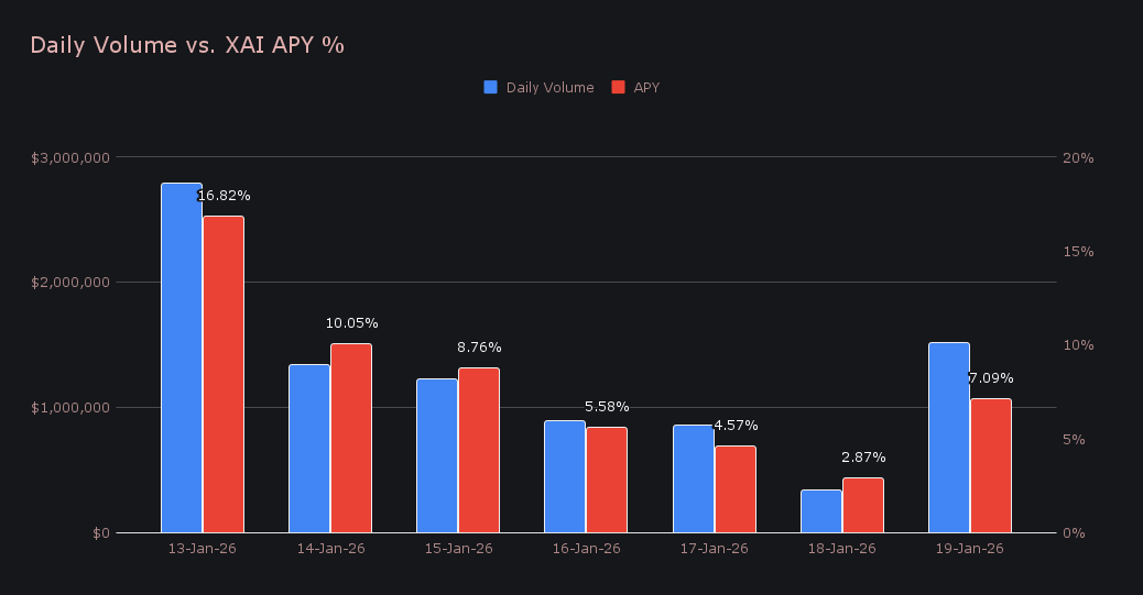 - Stakers earned 204,406 XAI ($22.7k) at a 7.96% average APY, the strongest yield in nearly eight weeks, with rewards peaking on January 13.