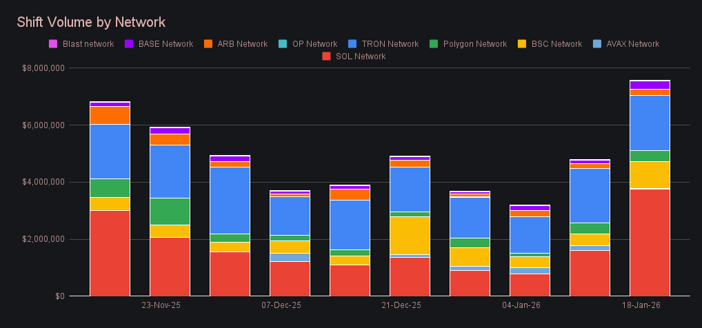 SideShift recorded a third consecutive week of growth, with gross weekly volume climbing to $8.93m (+33.9%), marking the platform’s highest weekly total since mid-November. The strength of the move was evident, with this week’s figure sitting roughly ~36% above the YTD average, even though only a handful of January data points have been recorded thus far. User shifting accounted for $6.20m (+29.1%), while liquidity shifting rose more sharply to $2.73m (+46.2%), reflecting increased internal rebalancing alongside higher throughput. Among top pairs, ETH↔SOL pairs combined for just under $1.19m in volume, with weight skewed towards SOL buying, making them by far the largest driver of user activity, while TRX/USDT (TRC-20) followed at a distance with $161k.
