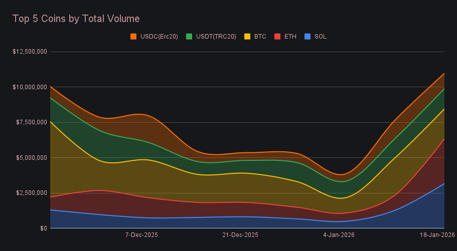 Stablecoins rounded out the top five, but ended with varying results. USDT (TRC-20) posted $1.43m in total volume (+5.1%), supported by user deposits of $352k (+42.7%), while settlements dropped to $641k (−5.8%), keeping Tron-based USDT at the helm of stablecoin usage despite the dip in demand. USDC (ERC-20) followed with $1.09m (−17.1%), where deposits rose to $394k (+52.4%) even as settlements fell more sharply to $349k (−26.7%). USDT(ERC-20) painted a similar story, ending in 6th place with a gross $1.09m (-17.1%).