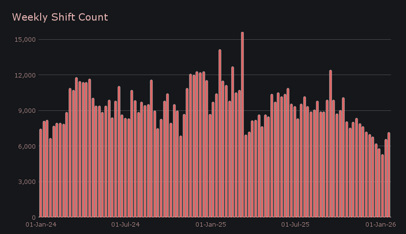 Alongside the rise in volume, shift count climbed to 7,157 total shifts (+8.5%), translating to daily averages of $1.28m in volume across 1,022 shifts. Activity has rebounded from a familiar low around the turn of the year, a level that has marked local troughs in both 2024 and 2025, and has since pushed back above those prior floors. The move back above these repeat low points points to renewed participation after the early-year dip, with weekly count once again trending higher.