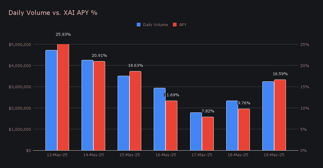 Staking conditions were solid, with users earning a strong average APY of 15.90% throughout the period. The standout moment came on May 13th, which saw 84,217.4 XAI distributed directly to our staking vault at a very healthy APY of 25.93%. This day also recorded a fantastic $4.7m in daily volume, the highest daily total so far in May. Altogether, XAI stakers received a total of 374,370.06 XAI or $50,783.93 USD in weekly rewards.