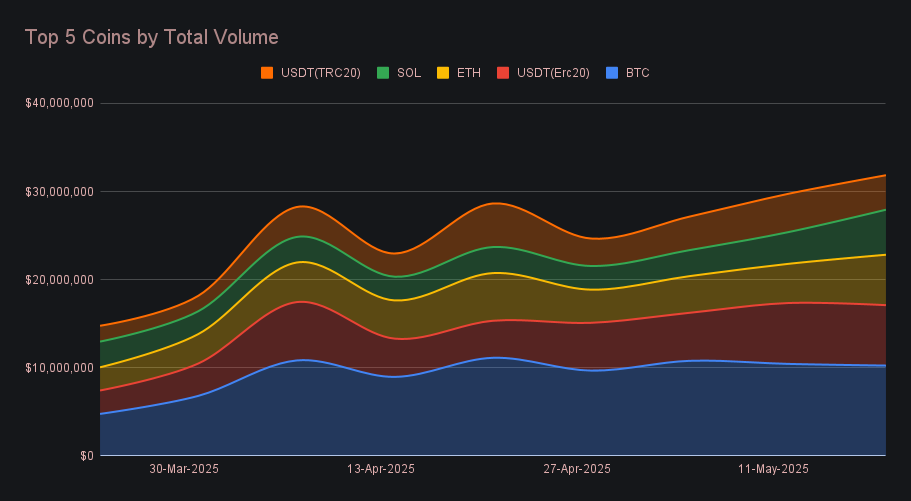 USDT (ERC-20) firmly held second place this week with a total volume of $6.9m (-0.7%), and has created some separation after being more neck and neck with ETH back in late March. User settlements continued to drive activity, rising to $3.4m (+1.3%), while deposits dropped to $1.6m (-10.4%). This reflects an ongoing trend on SideShift, where users are increasingly shifting out of BTC and ETH into Ethereum-based stablecoins - with USDT as the clear favorite, a pattern reinforced by the strength of our top shift pair.