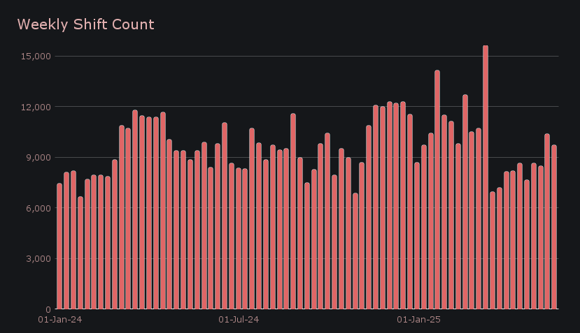 Gross shift count displayed a bit of a different trend, pulling back slightly to 9,741 (-6.2%), though this still landed within 3% of our year-to-date running average. The overall drop reflects a lighter week in smaller-scale shifts, despite volume staying elevated. When combined with gross volume, this weekly total produced daily averages of $3.25m in volume alongside 1,392 shifts.