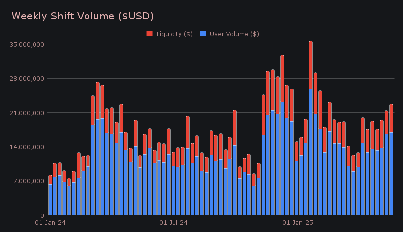 This past week saw SideShift register a noteworthy performance, with gross volume climbing to $22.7m (+6.6%) - a figure that now lands within our top 5 highest weeks of 2025. Much of this volume stemmed from shifts completed directly on the site, suggesting a strong presence of hands-on users throughout the week. User shifting summed $17.0m (+1.9%) while liquidity shifting rose to $5.7m (+23.3%), making a decent jump after accounting for a smaller overall proportion last week. BTC/USDT (ERC-20) once again ran away with the top spot among all user pairs, finishing with $2.26m in volume. To put its dominance in context, the next closest user pair, ETH/BTC, settled for just one third of that total.