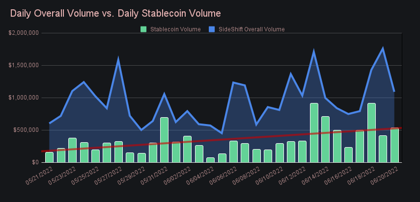 The increased use of stablecoins on SideShift is clear - even less favored stablecoins DAI and USDC on the Polygon network nearly doubled in overall action this week, with respective total volumes (deposit + settlements) of $234k and $142k. The below chart displays total stablecoin action when compared to overall SideShift daily volume for the past month - a prominent uptrend can be seen.
