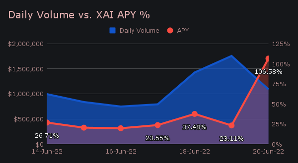 It’s a great time to be a XAI staker, as the APY averaged 36.77% for the week (~10% above our all time average). On June 21st a weekly high reward sum of 64,204.45 XAI was distributed to stakers which amounted to an incredible APY of 106.58%. This was the result of both a decrease in XAI price and steady overall site volume.