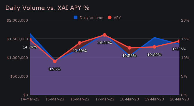 XAI stakers were rewarded with an average APY of 13.1% throughout the week, with a daily rewards high of 36,056.15 XAI (an APY of 16.01%) being distributed directly to our staking vault on March 18th, 2023. This was following a daily gross daily volume of $1.6m. As a whole, this week stakers received a total of $30,286.20 USD, or 212,516.96 XAI.