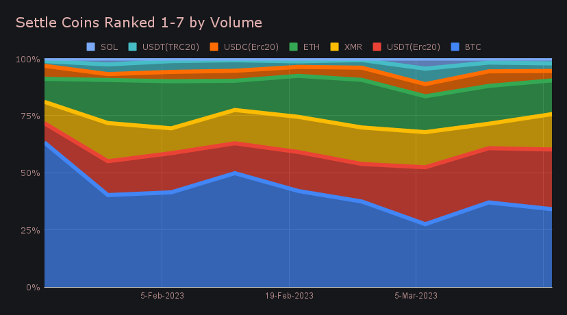 USDT (ERC-20) finished as the week’s second most demanded coin, with settle volume growing 22.5% to end with $2.07m. This far outweighed even all other stablecoins combined, and despite USDT (ERC-20)’s growth in demand, all other stablecoins fell 21.3% to total just $941k in settle volume. Instead of stables, coins such as XMR and SOL saw jumps in demand. XMR settlements boomed by 61.2% this week to finish with $1.23m, while SOL had a respectable increase of 33.6%, even though at a much lower volume of $167k. Certain other coins such as LTC, ATOM and FTM saw significant growth in settle volume, perhaps an early indication of alt season coming. You can note in the chart below the general downtrend of BTC settlements, while other top coins seem to be growing over time.